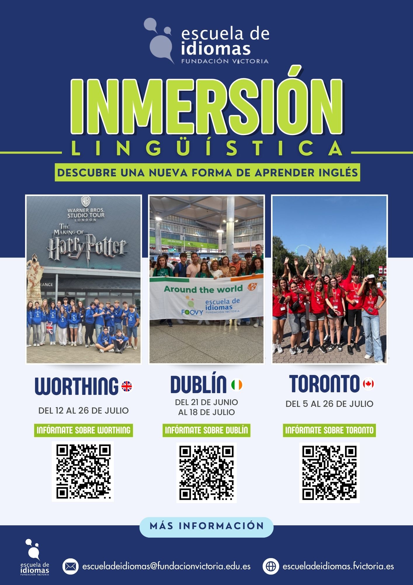 La Escuela de Idiomas Fundación Victoria ha puesto en marcha la inscripción para los Programas de Inmersión Lingüística Internacional 2026, una iniciativa educativa dirigida a alumnado a partir de 5º de Primaria y abierta tanto a familias de Fundación Victoria como a familias externas interesadas.