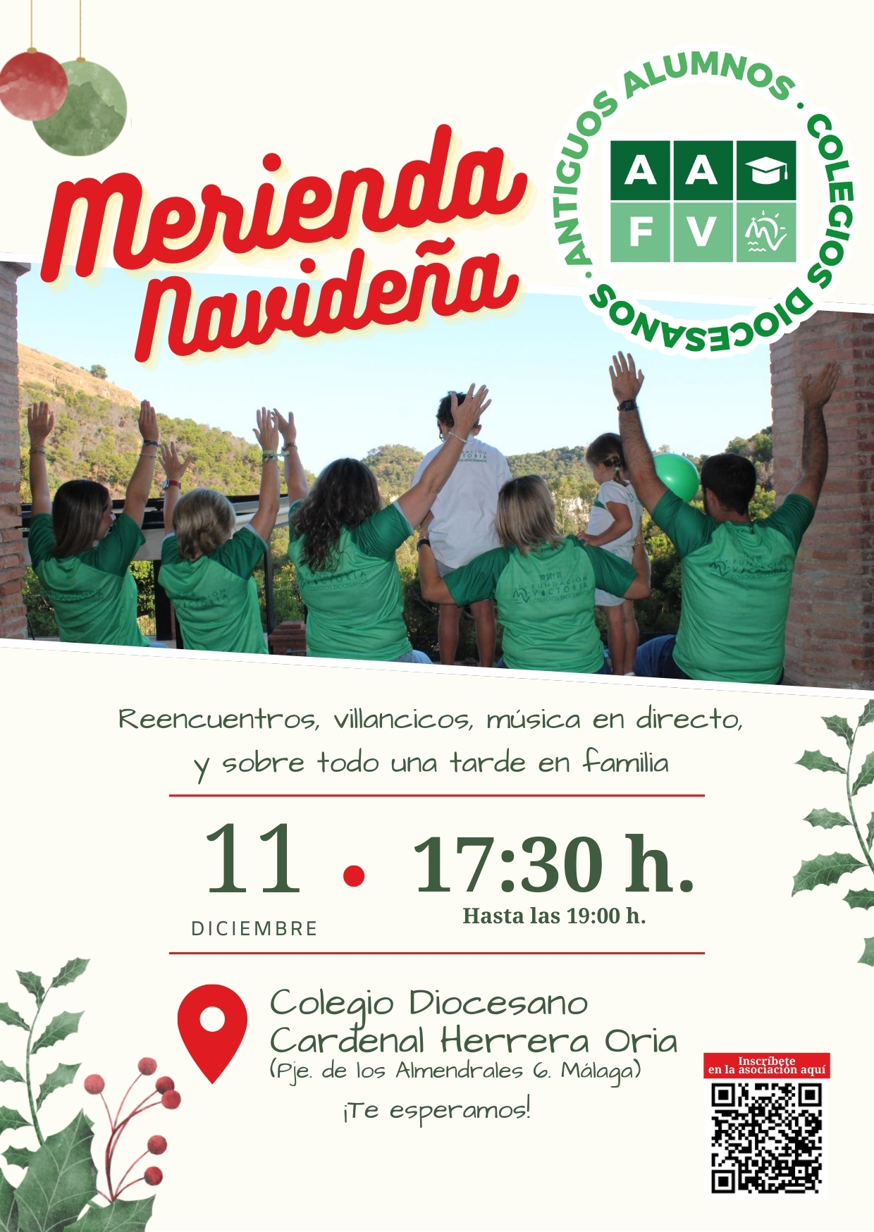 La Asociación de Antiguos Alumnos de los Colegios Diocesanos de Fundación Victoria celebrará el próximo 11 de diciembre una merienda navideña abierta a todos los antiguos alumnos y alumnas de nuestra red educativa. El encuentro tendrá lugar en el Colegio Diocesano Cardenal Herrera Oria (Pasaje de los Almendrales 6, Málaga) de 17:30 a 19:00 h.